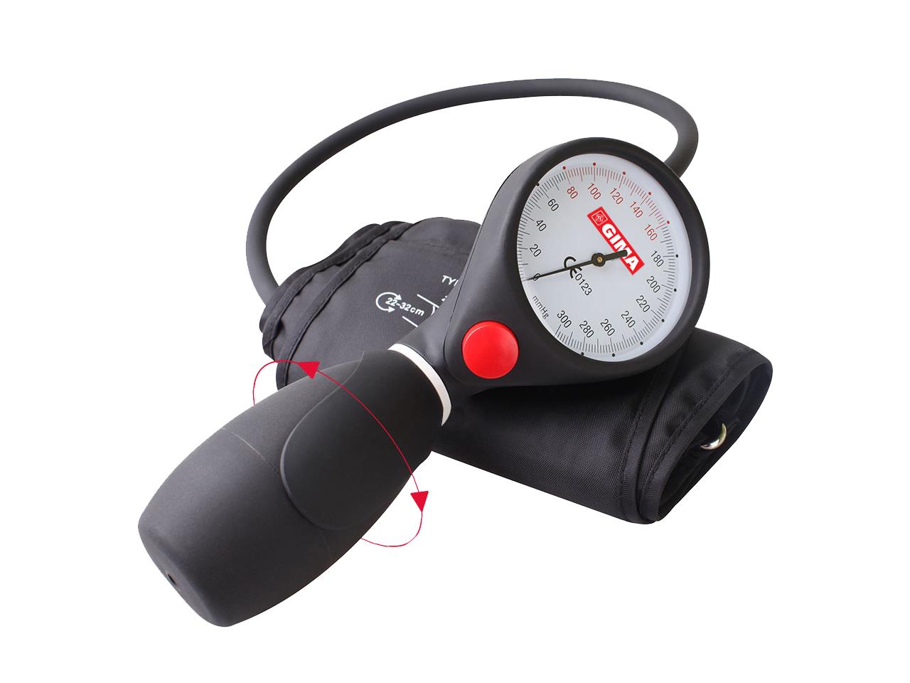 Sfigmomanometro aneroide con bracciale adulto di colore nero. Ampio quadrante da 65 mm di diametro e valvola di rilascio aria a bottone. Struttura realizzata in plastica ABS leggera, ma shock-proof.