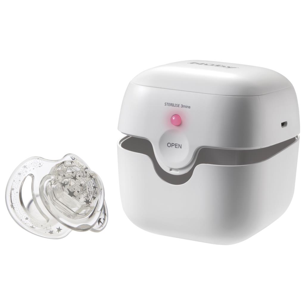 Con lo sterilizzatore UV portatile di Nuby non sono più necessari acqua o microonde. Basta aprire la scatolina, inserire il succhietto, chiudere e premere il pulsante 'sterilizza' per avviare il processo UV.