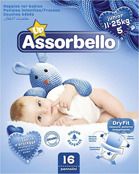 La nuova linea di pannolini Assorbello Up concepita grazie a un nuovo e innovativo concept, grazie alla morbida chiusura elastica superavvolgente e alle bande laterali che garantiscono una maggiore tenuta e protezione; inoltre, il core superassorbente ed il tessuto traspirante assicurano una pelle più asciutta e fresca, mentre la costruzione anatomica nella zona inguinale consente la massima libertà di movimento.
