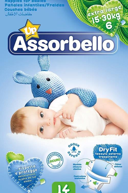 La nuova linea di pannolini Assorbello Up concepita grazie a un nuovo e innovativo concept, grazie alla morbida chiusura elastica superavvolgente e alle bande laterali che garantiscono una maggiore tenuta e protezione; inoltre, il core superassorbente ed il tessuto traspirante assicurano una pelle più asciutta e fresca, mentre la costruzione anatomica nella zona inguinale consente la massima libertà di movimento.