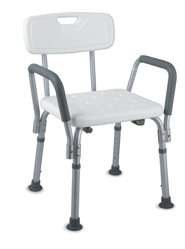 Sedia da doccia con braccioli e schienale. La struttura è in alluminio, mentre seduta e schienale sono in plastica.