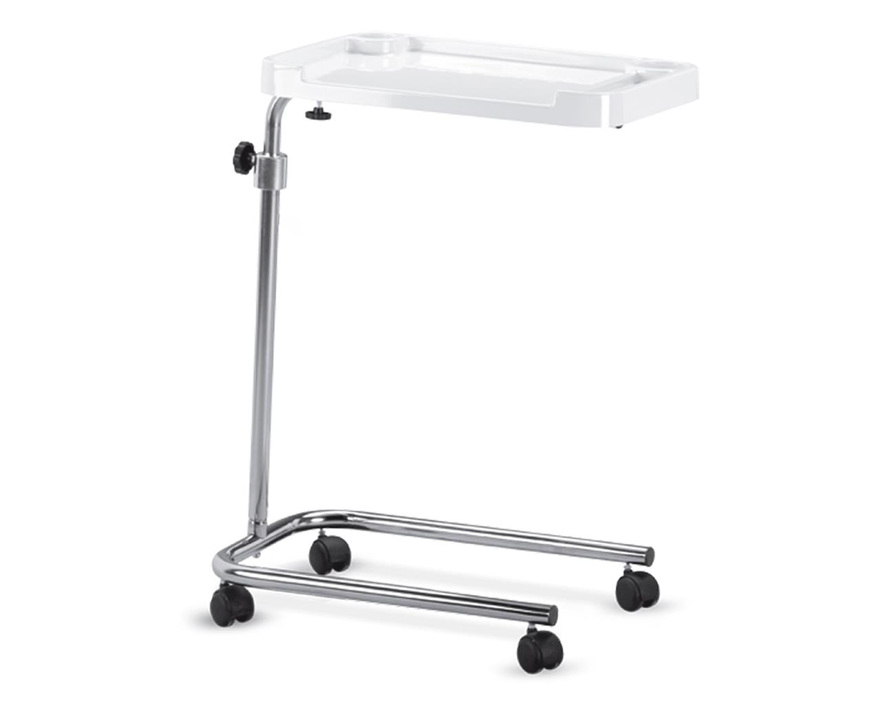 Tavolino serviletto con telaio costituito da tubi in acciaio cromato e vassoio in plastica termoformata antiurto con bordi rialzati e portabottiglia, portabicchiere e portaposate preformati. Base con 4 rotelle Ø 50 mm.