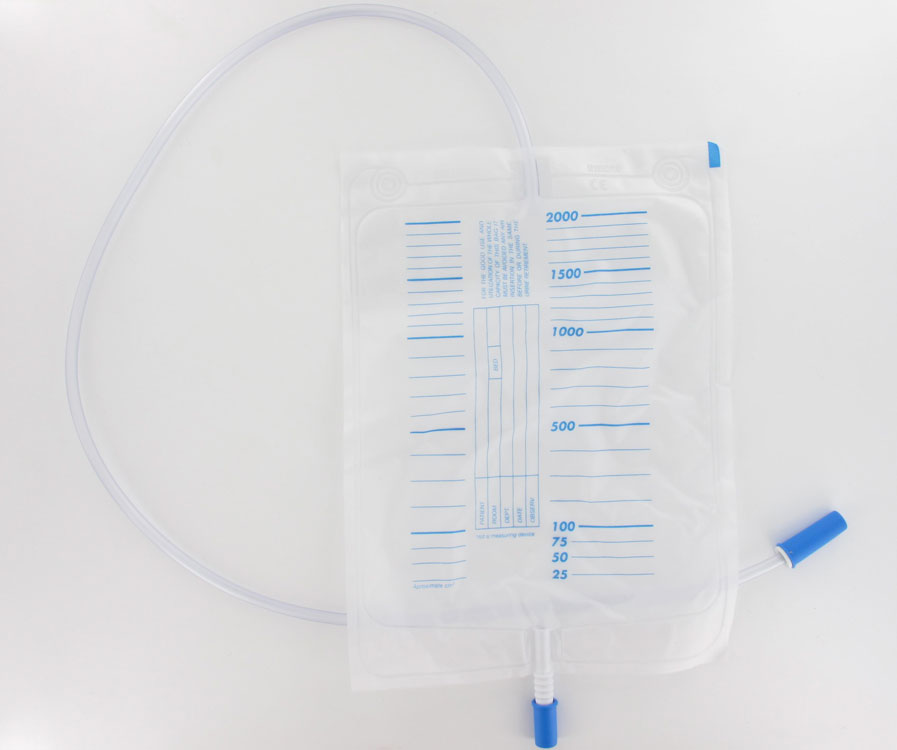 Sacche urine con valvola antireflusso e rubinetto di scarico.