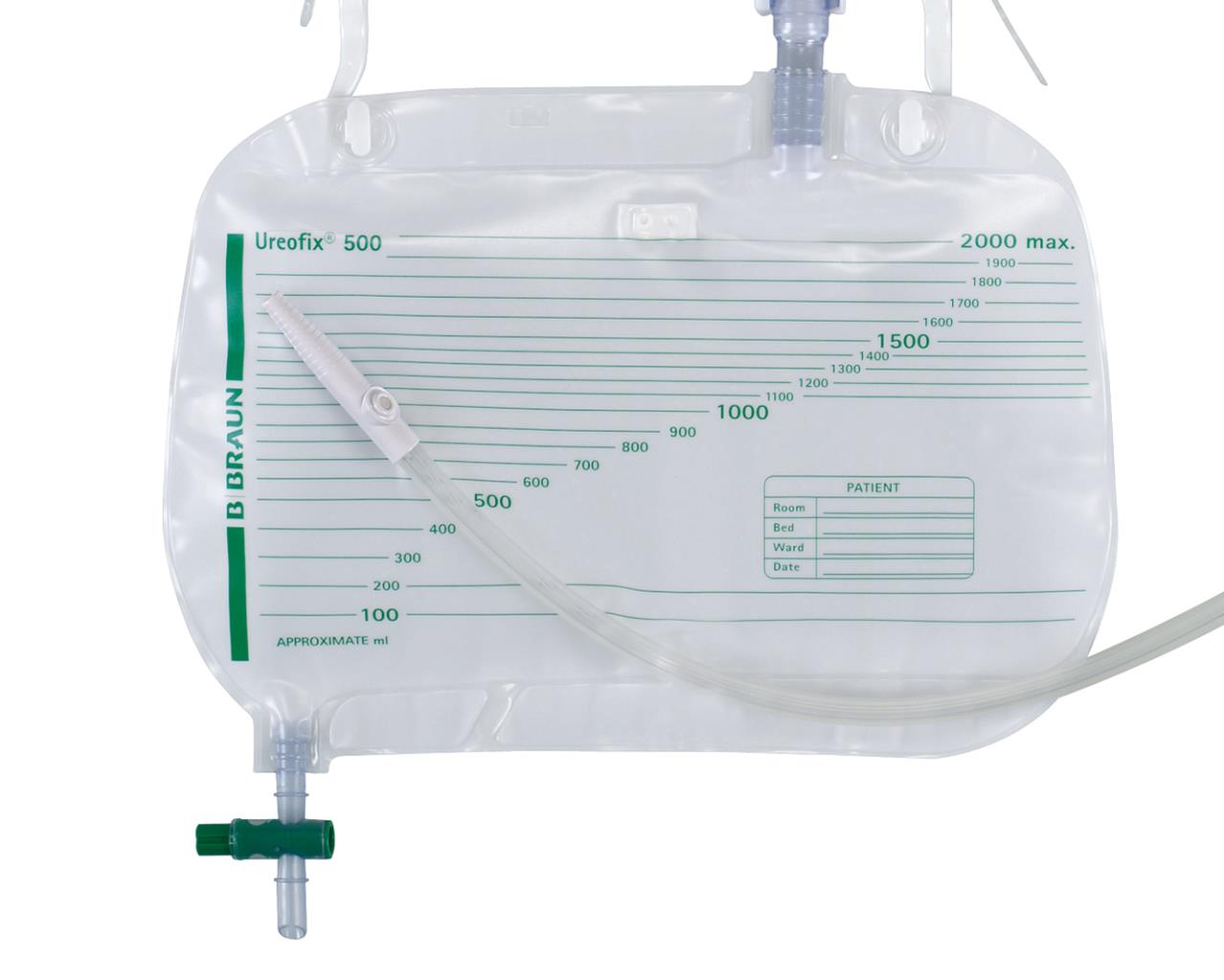 Sacca per raccolta urina di ricambio per Ureofix® 500 Classic di B. Braun con capacità da 2 litri, rubinetto di svuotamento, valvola antireflusso e filtro di ventilazione antibatterico e idrofobico.