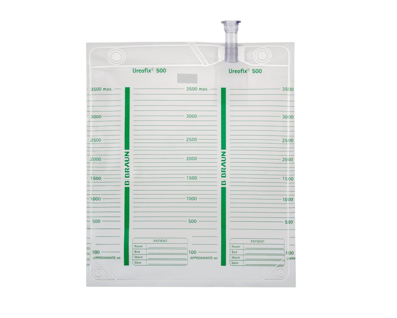 Sacca per raccolta urina di ricambio per Ureofix® 500 Classic di B. Braun con capacità da 3,5 litri, valvola antireflusso e filtro di ventilazione antibatterico e idrofobico.