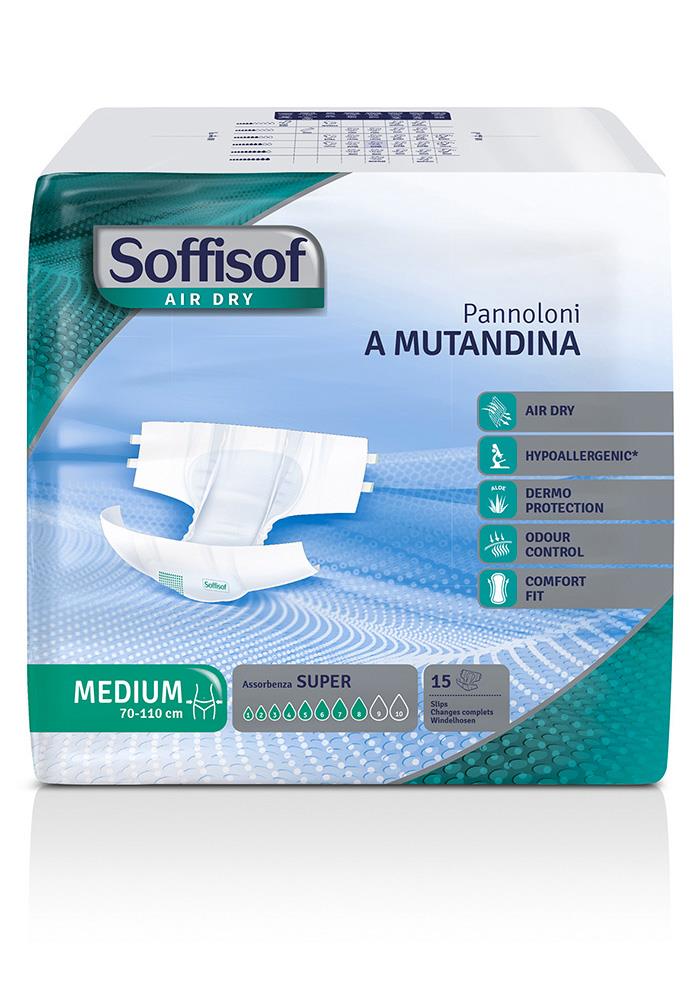 Il pannolone a mutandina Soffisof Air Dry SUPER è indicato per incontinenza urinaria e/o fecale da media a grave e assicura la massima sicurezza e comfort a utilizzatori sia autosufficienti che allettati.