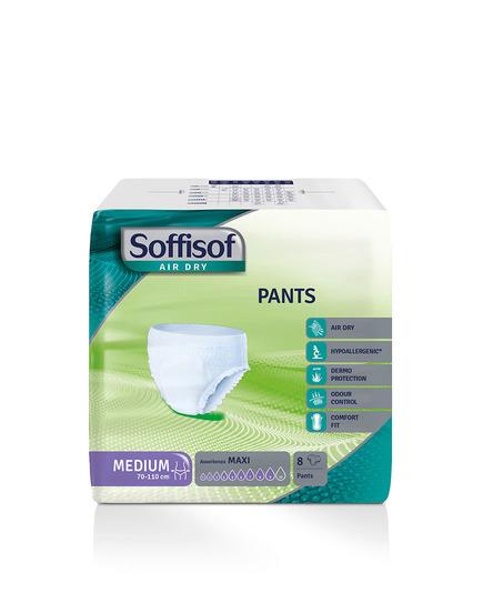 Soffisof Air Dry Pants Maxi è una mutandina assorbente monouso ideale per pazienti deambulanti, autosufficienti e attivi, con perdite da gravi a molto gravi.