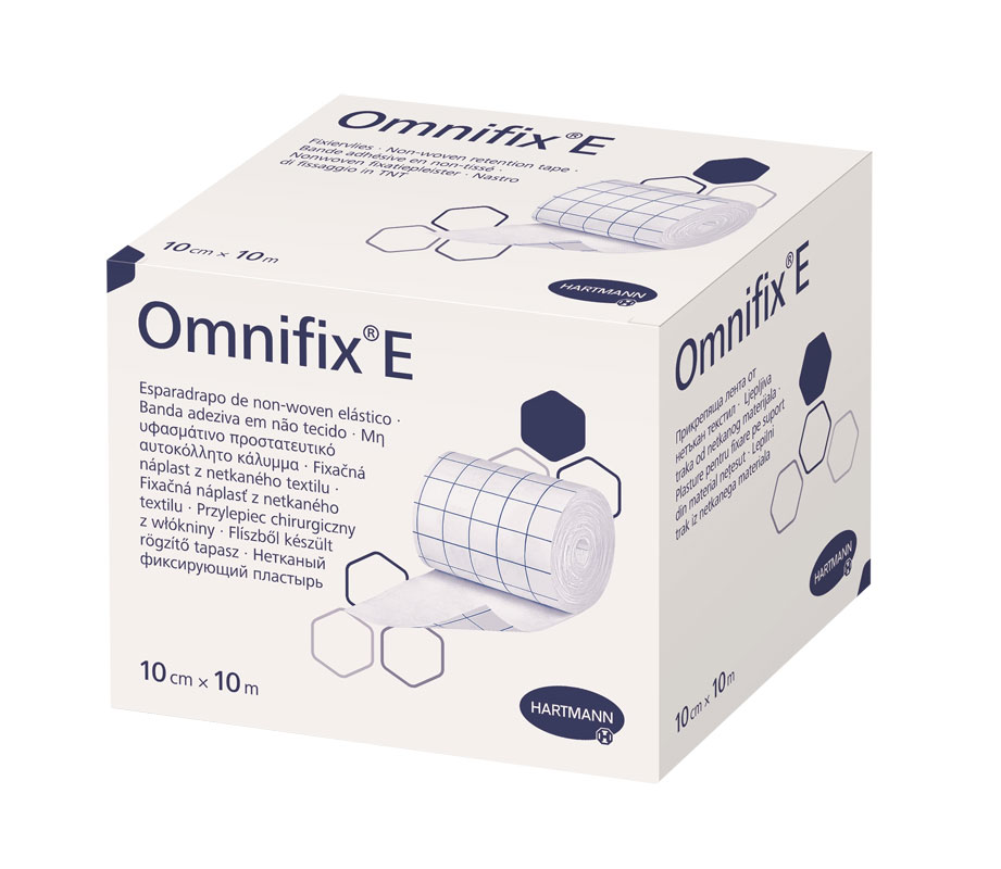 Omnifix E è un nastro di fissaggio in TNT bianco con struttura perforata ad elevata elasticità. La parte adesiva è in gomma sintetica ipoallergenica distribuita a strisce con tecnologia "Hotmelt".