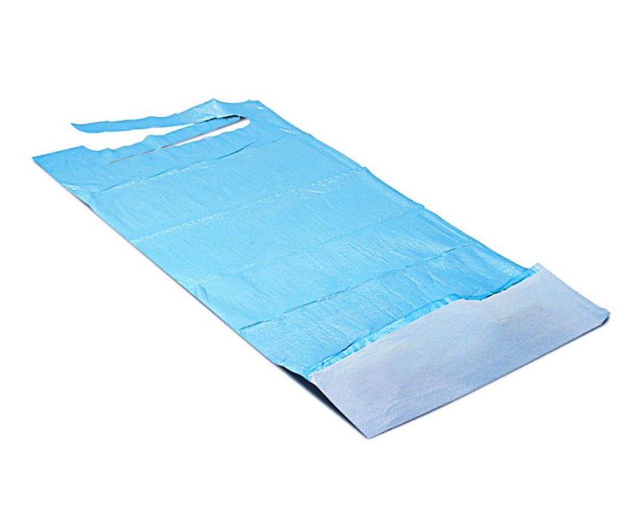 Bavaglio impermeabile con tasca e lacci di chiusura, biaccoppiato, composto da uno strato di carta riciclata ad alto assorbimento incollato ad una pellicola di polietilene.