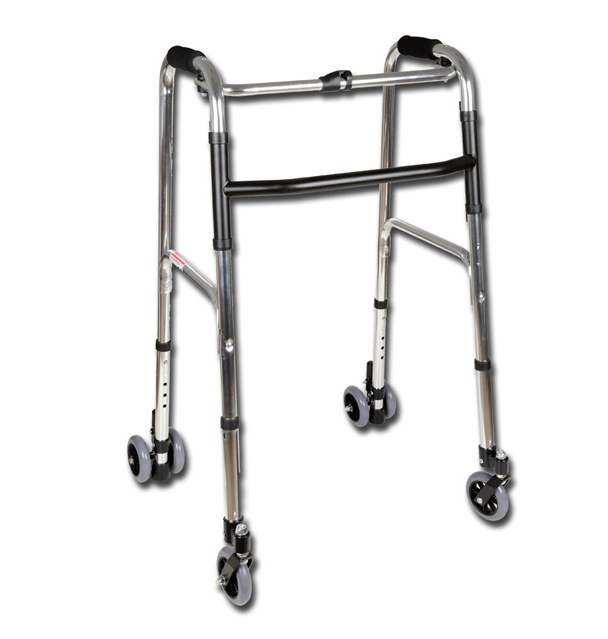 Prodotto in alluminio con 2 ruote anteriori piroettanti e 2 posteriori con freno e gommini antiscivolo. Richiudibile.