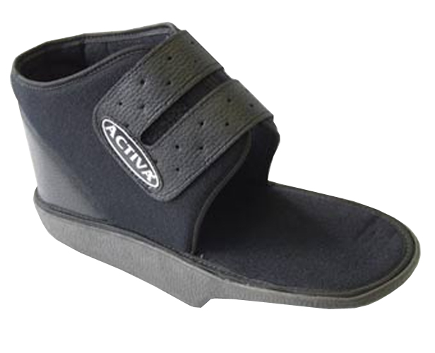 Calzatura post-operatoria alta, ambidestra, con chiusura a velcro regolabile e con ampio margine per favorire la calzata.