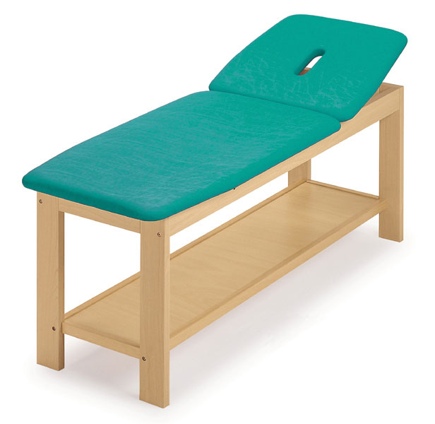 Lettino da visita e trattamenti con solida struttura in legno a una sezione mobile, testata con sistema di regolazione manuale ed una sezione fissa.