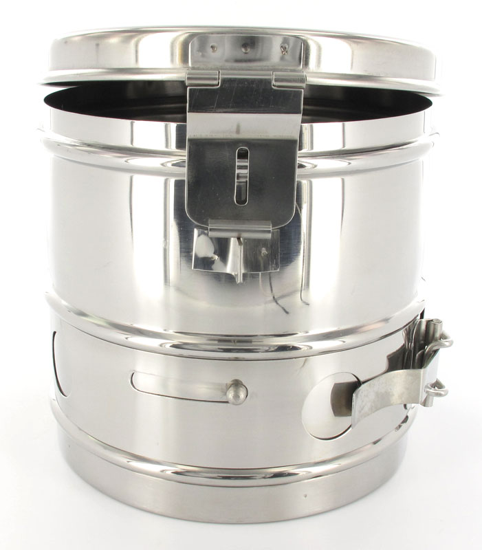 Drum cilindrico in acciaio inox per sterilizzazione in autoclave o sterilizzatrice a secco. Dotato di banda scorrevole interna e maniglia.