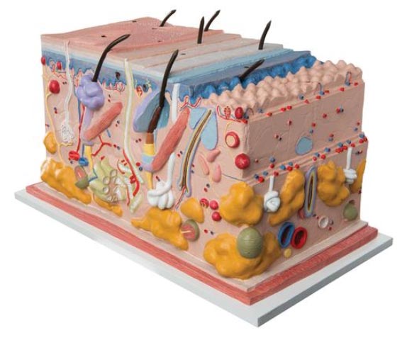 Straordinario modello su base, ingrandito 70 volte, che mostra tridimensionalmente i tre strati della cute e le sue strutture.