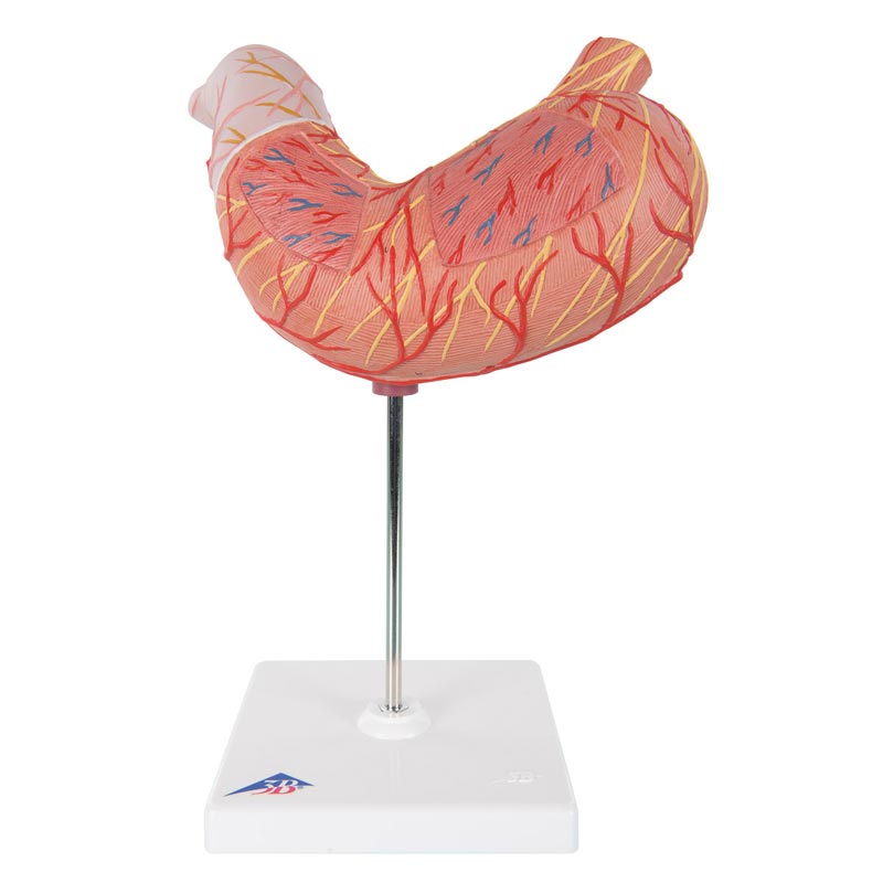 Modello in due parti di stomaco su cavalletto che mostra i vari strati della parete gastrica, dalla cardias al piloro. La metà anteriore dello stomaco è staccabile.
