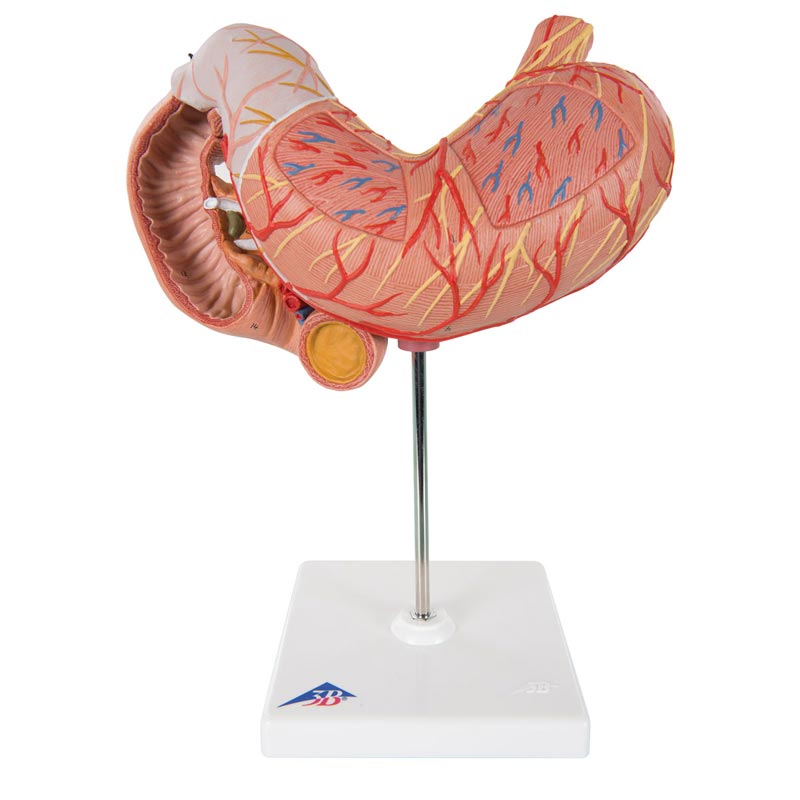 Modello in tre parti di stomaco su cavalletto che mostra i vari strati della parete gastrica dalla cardias al piloro. La metà anteriore dello stomaco, pancreas e duodeno staccabili.