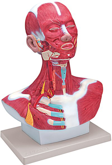 Questo modellino anatomico mostra i muscoli della testa, del collo e del tratto toracico superiore. Le muscolature superficiali e profonde sono ben rappresentate. Allo stesso modo le arterie della carotide e i condotti sub-claveari sono riprodotti minuziosamente dal modellino anatomico.