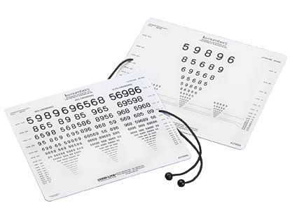 Test, in formato card, che misura l’acuità visiva da vicino caratterizzato da numeri disposti su linee con spaziatura standard fatta eccezione per le ultime tre che hanno invece spaziature ridotte del 50%, 25% e 12,5%.