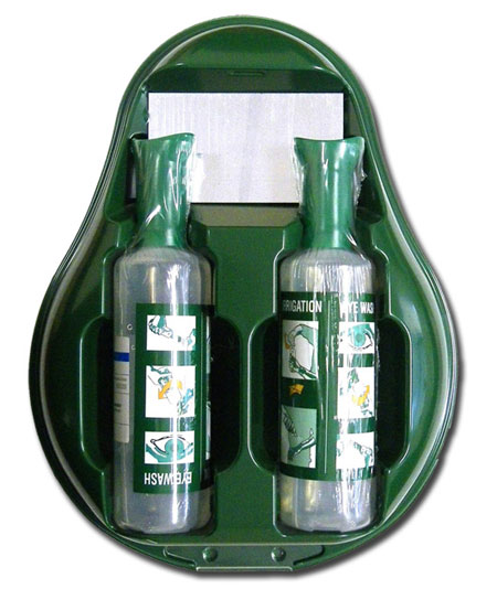 Lavaggio oculare "Drop" contenente soluzione fisiologica in kit termoformato da muro con tutti i componenti necessari per un efficace lavaggio oculare di primo soccorso: 2 soluzioni saline sterili da 500ml, 2 coppette per occhi ed uno specchio.