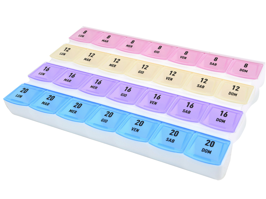 • La dose giornaliera è distribuita in scomparti aventi un colore diverso per mattino, mezzogiorno, pomeriggio e sera
